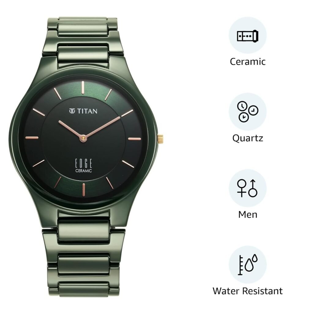 Watch Titan Edge Ceramic Green Dial Analog Ceramic Strap Watch for Men Was ₹28,345 Now ₹1,999 Sale 40.5mm contemporary sizeFeatures a ceramic case resistant to scratchesErgonomic glossy ceramic braceletA push-button butterfly clasp for effortless wearingRose gold hands and indicesKnurled crownscratch-resistant sapphire glass crystal Quantity Enter an amount ₹ Add To Cart Buy Now You may also like Sale Watch Titan Edge Ceramic Analog Black Dial Men’s Watch ₹1,999 Compare to ₹28,345 Sale Watch Titan Fashion Analog Blue Dial Men’s Watch ₹1,999 Compare to ₹28,345 Sale Watch Titan Titan Neo Analog Black Dial Men’s Watch ₹1,999 Compare to ₹28,345